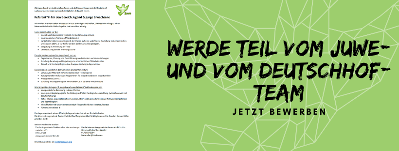 Das juwe ist ein Jugendwerk der süddeutschen Mennonitengemeinden. Im juwe haben wir das Ziel, zu einem Leben mit Jesus zu ermutigen und zu helfen, Christsein im Alltag zu leben.